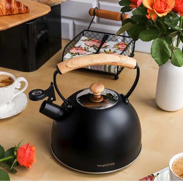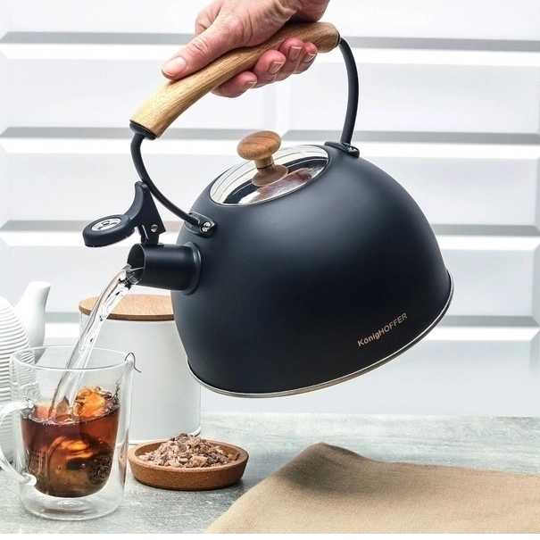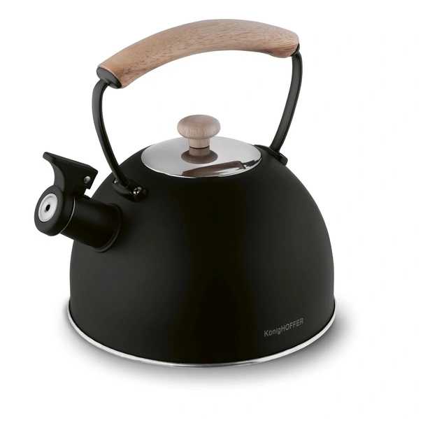 Nerezový čajník Konighoffer Morena 2,3 l čierny vyzerá skvele na sporáku, takže získate štýlové vybavenie kuchyne. Odnímateľné veko a výklopná píšťalka uľahčujú prípravu nápojov a zaisťujú bezpečnosť. Nerezová oceľ zabezpečuje kanvici trvanlivosť, odolnosť a tiež sa stará o zdravie vašich blízkych (neovplyvňuje vlastnosti vody). Tvrdý a ekologický držiak je vyrobený z kaučukového dreva. Stačí jedna ruka, aby ste s jeho pomocou naplnili poháre vriacou vodou. Klasický a tlmený tvar korpusu spestrí vybavenie vašej kuchyne.