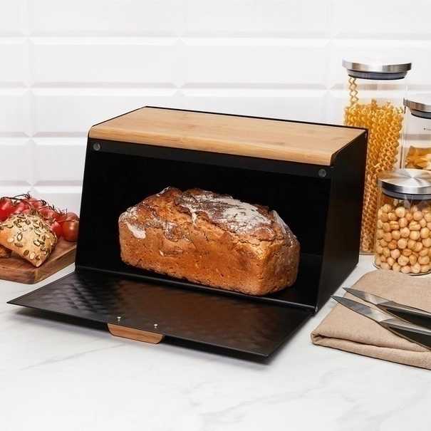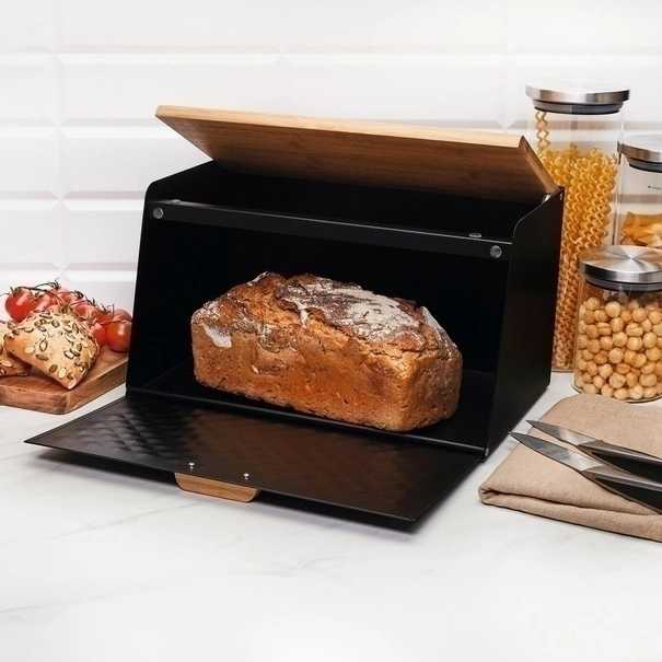 Chlebník má bambusový poťah, ktorý sa skvele hodí na krájanie chleba, takže nie potrebné ďalšia doska na krájanie navyše. Bambusové drevo je mimoriadne odolné, ale zároveň je najekologickejšou surovinou na svete .Vďaka jedinečnému dizajnu bude štýlovým prvkom vybavenia kuchyne. Hladké povrchy sa ľahko udržiavajú v čistote. Model má dvojité, výklopné – bambusové a kovové – uzatváranie. Kryty dobre chránia obsah pred znečistením a svetlom. Kov (uhlíková oceľ) s práškovým náterom a bambusové prvky sú veľmi trvanlivé. Zmestí sa chlieb a rožky pre celú rodinu. Je to návrh pre tých, ktorí oceňujú čerstvosť, chrumkavosť a arómu čerstvého pečiva a hľadajú pevný, kompaktný chlebník. Stabilne ho umiestnite na kuchynskú dosku.
