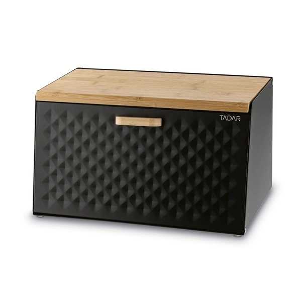 Chlebník kovový s bambusovým vekom čierny Geometric je moderný a zabezpečí, že pečivo zostane dlhšie čerstvé. Vďaka svojmu modernému obdĺžnikovému tvaru geometrickou textúrou a nadčasovou čiernou farbou sa stane štýlovým prvkom každej kuchyne.