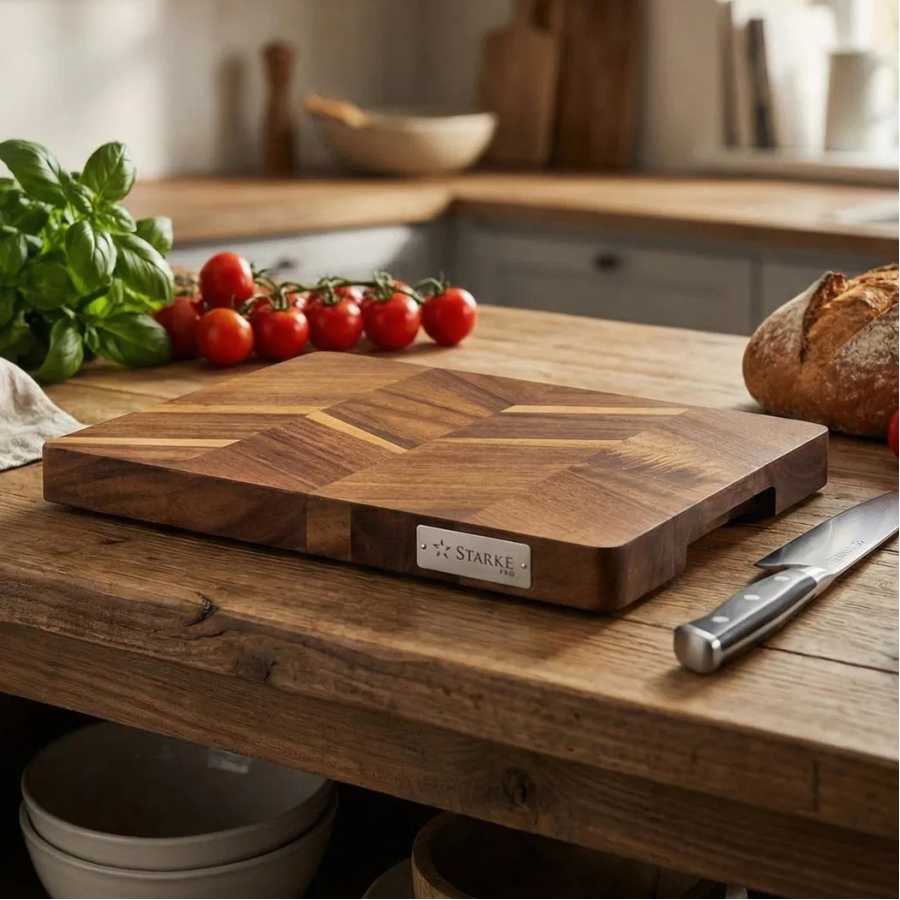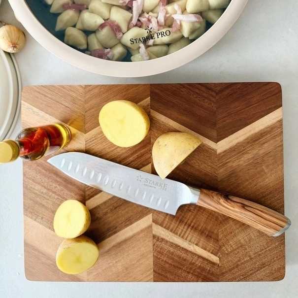 Táto hrubá doska na krájanie s ABS nožičkami je vyrobená z krásne štruktúrovaného akáciového dreva . Je tvrdá, má sýtu farbu a je ideálna do náročných kuchynských priestorov .Vďaka impregnácii je táto doska na krájanie trvalo odolná voči vlhkosti. Okrem toho, že slúži ako doska na krájanie, jej povrch sa dá použiť na servírovanie teplých alebo studených predjedál.