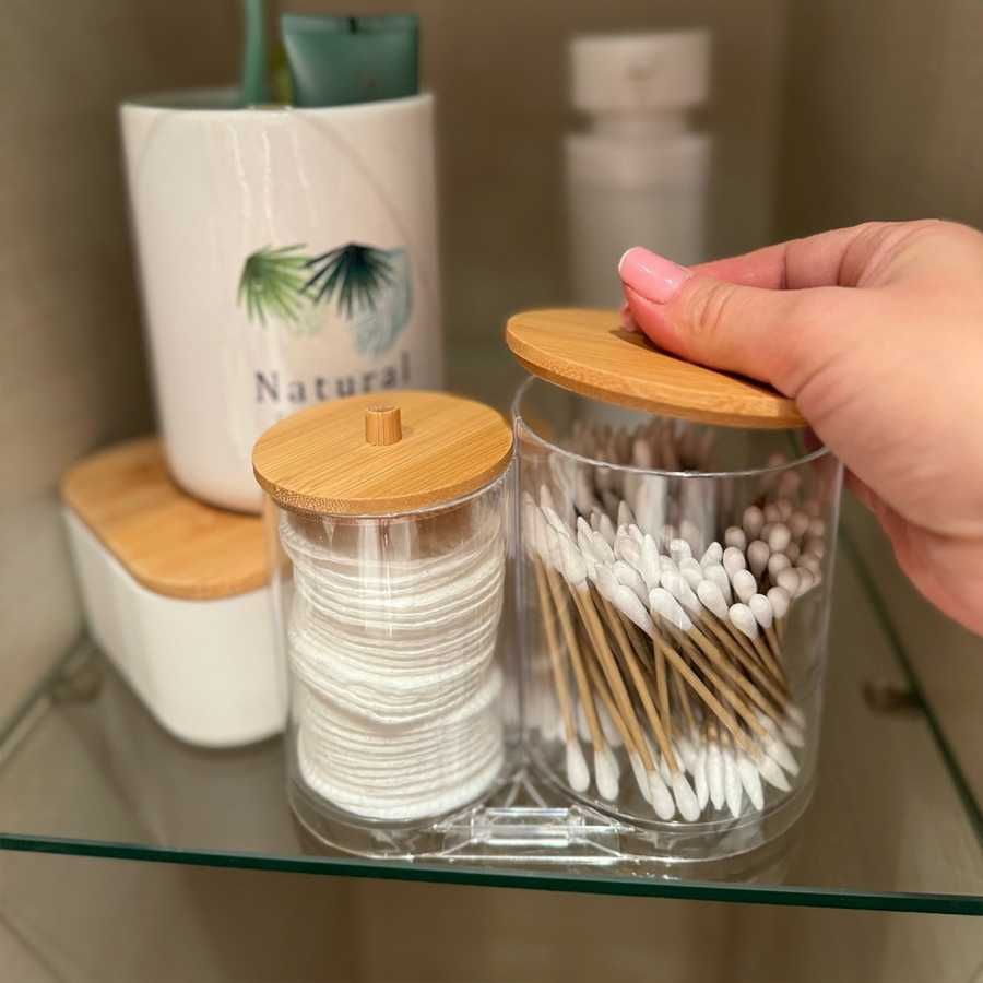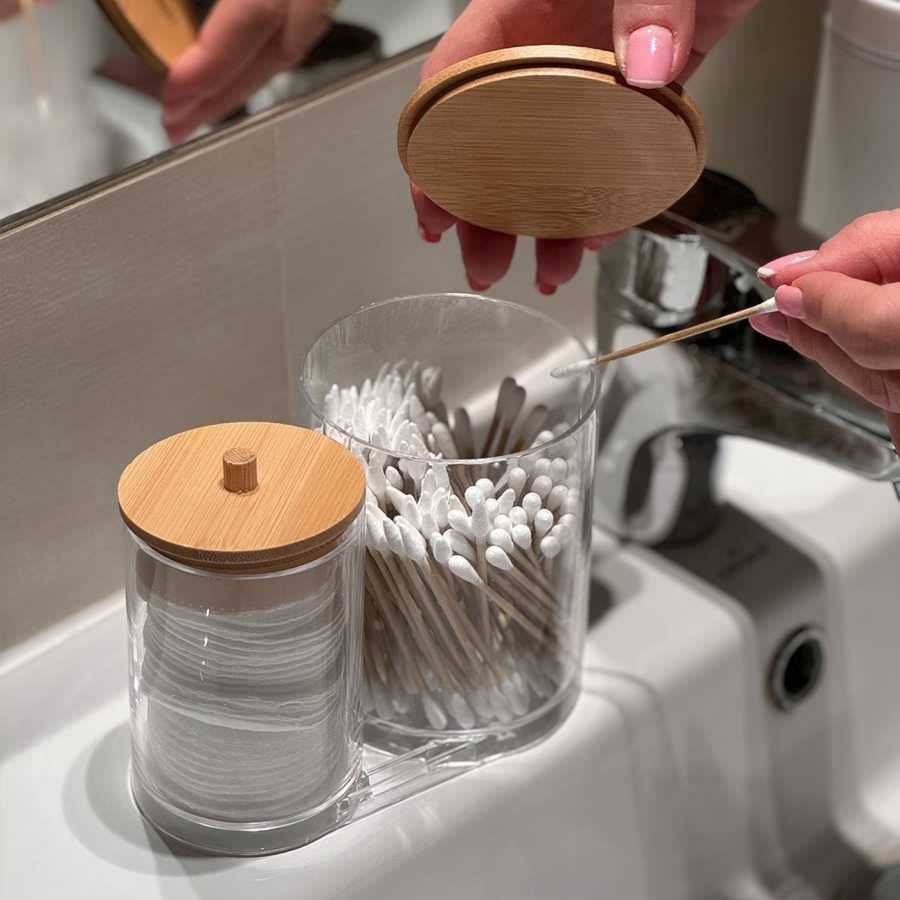 Priehľadný plastový organizér s dvomi priehradkami a bambusovými viečkami na vatové tampóny, tyčinky či bomby do kúpeľa hygienicky organizuje kúpeľňu.Produkt ponúka jednoduchý prístup k obsahu a stabilnú polohu na dosah ruky.