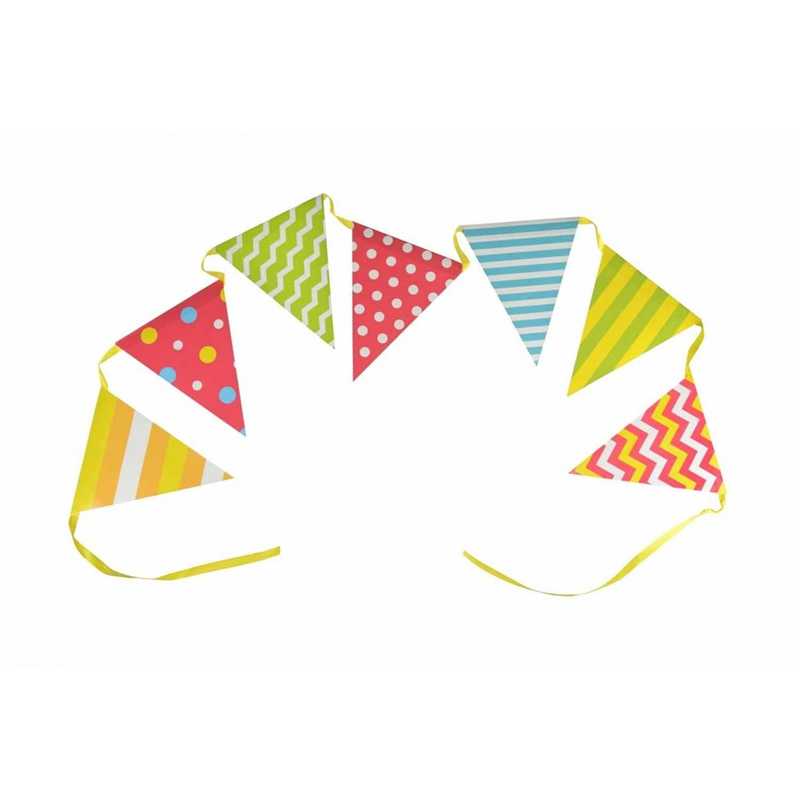 Táto dekoratívna girlanda v žiarivom, viacfarebnom štýle je všestranným doplnkom do akéhokoľvek priestoru na detské oslavy, záhradné párty a všetky vonkajšie a tematické podujatia. Vlajky v klasickom trojuholníkovom tvare sú obojstranne potlačené, čo zaisťuje esteticky príjemný vzhľad zo všetkých strán a umožňuje jednoduché zavesenie kdekoľvek. Motívy ako bodky, cikcaky a pruhy v kombinácii so žiarivými farbami priťahujú pohľady a vytvárajú radostnú a živú atmosféru. Girlanda vyzerá skvele zavesená nad stolom, pri vchode, v záhrade alebo na terase.