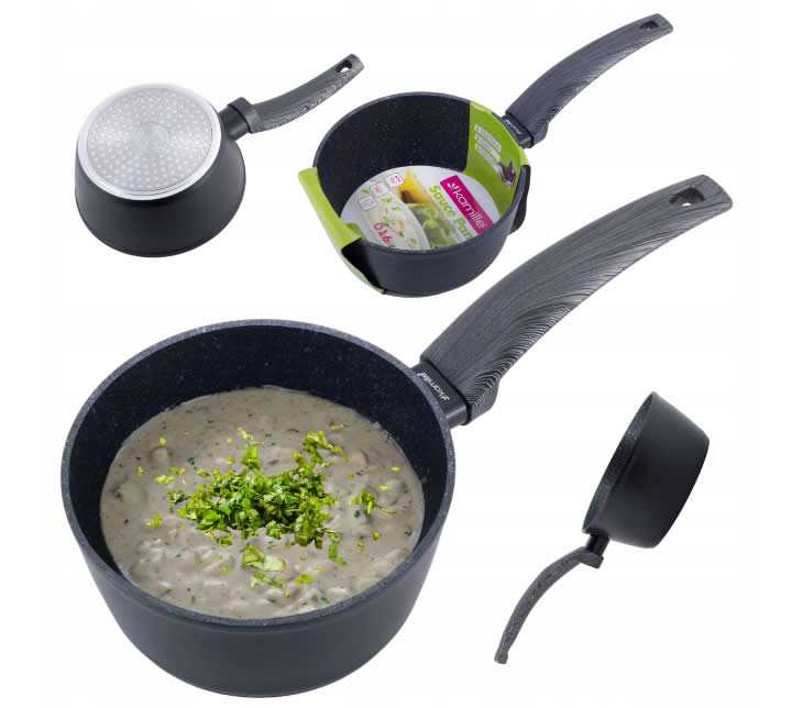 Randlík je vyrobený z vysokokvalitného tlakovo liateho hliníka, rukoväť-bakelit má povrchovú úpravu „Soft-touch“ Špeciálny GRANITOVÝ povlak, ktorý má antiadhézne vlastnosti - zabraňuje lepeniu, je odolný voči poškriabaniu a vysokým teplotám. Steny a dno sa rýchlo zohrejú a udržia v teple dlhú dobu. Je vhodný na všetky typy sporákov, vrátane indukčných. Na randlík sa neodporúčajú používať kovové pomôcky.