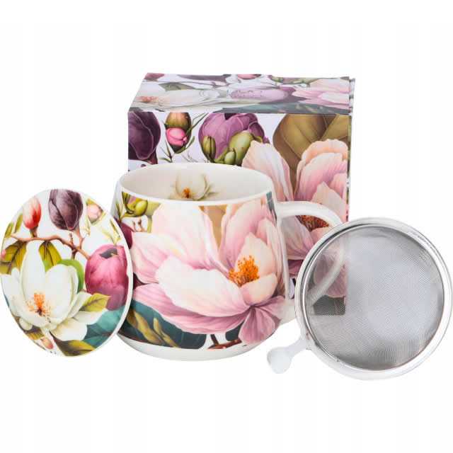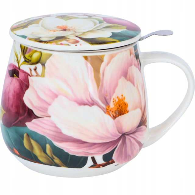 Hrnček 430 ml s kovovým sitkom a pokrievkou TULIPÁNY.Vyrobený z porcelánu New Bone China, ktorý sa vyznačuje elegantnou a prirodzenou krémovo-bielou farbou s jemným leskom a výnimočnou pevnosťou, pričom si zachováva ľahkosť a jemnosť.Vynikajúci na prípravu obľúbených byliniek a aromatického čaju.
