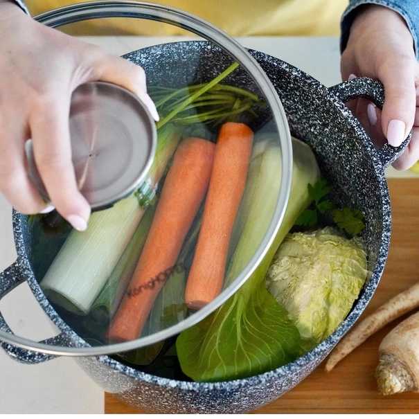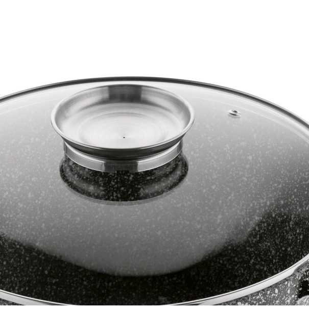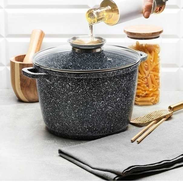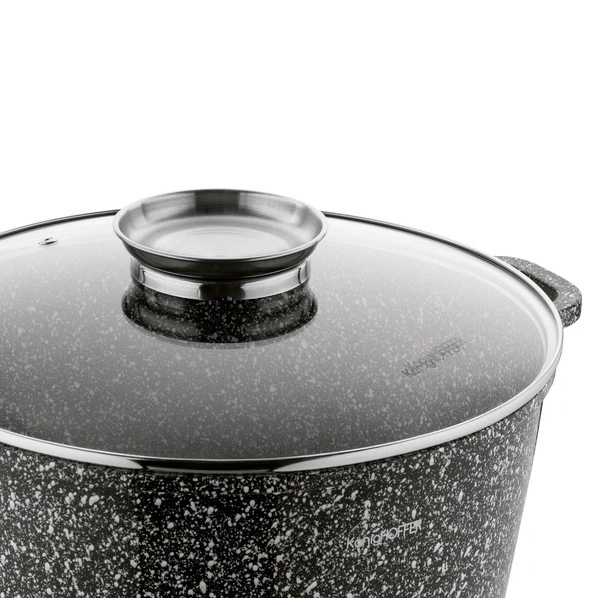 Hrniec na indukciu Konighoffer Kingstone  so sklenenou pokrievkou vybavenou aromatizérom, ktorý umožňuje sledovať obsah hrnca a pridávať tekuté koreniny, vodu, víno či olej bez zdvíhania pokrievky, čo zachováva paru vnútri. Súčasťou sú tiež dve silikónové návleky na úchyty.Povrch keramického hrnca je navrhnutý tak, aby vyzeral ako čierno-biely mramor. Hrniec pôsobí veľmi vkusne a prestížne. Praktické úchyty zlepšujú komfort používania, sú tiež liate, čo im dodáva pevnosť. Zabezpečujú bezpečné prenášanie horúceho riadu, hoci je vždy potrebné používať kuchynské rukavice.Liatie úchytov ako integrálna súčasť tela riadu znamená, že sa spolu s hrncom zohrievajú. Preto pri prenášaní alebo vyberaní z rúry je potrebné používať ochranné návleky alebo rukavice na zabránenie popálenín.