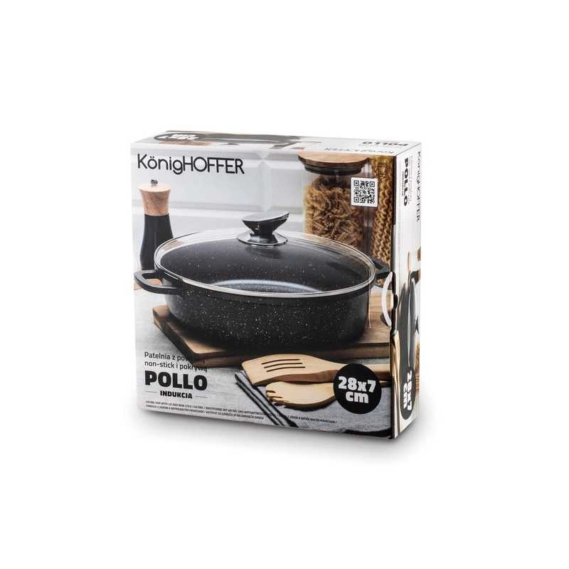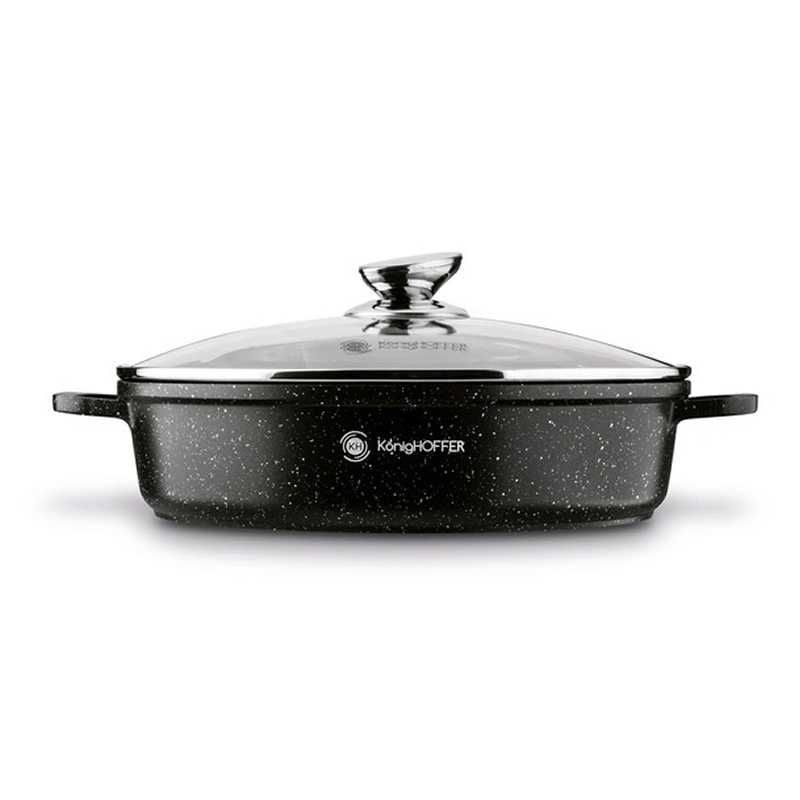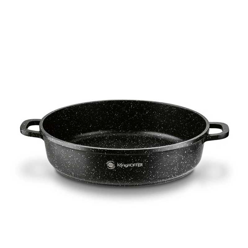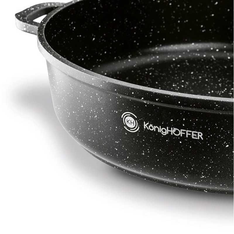 Hlboká mramorová panvica Konighoffer Pollo Black 32 cm s krátkymi úchytmi je plytký hliníkový hrniec vhodný na indukciu. Je to ideálna panvica pre tých, ktorí očakávajú vysokú kvalitu! Telo je liate technológiou die cast, čo zabezpečuje perfektnú rovnováhu a vysokú pevnosť. Rovnomerne sa zahrieva a rýchlo reaguje na zmeny teploty, čím zaručuje dlhotrvajúcu službu vo vašej kuchyni.