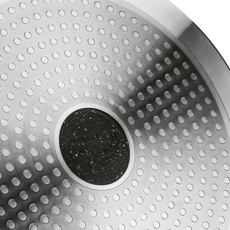 Interiér panvice je pokrytý netoxickým nepriľnavým povrchom MARBLE PLUS, ktorý vyzerá ako mramor a vydrží až 10 000 cyklov opotrebenia. Tento tvrdý nepriľnavý povrch tiež uľahčuje údržbu panvice a je odolný voči poškriabaniu. Je označený ako PFOA Free.