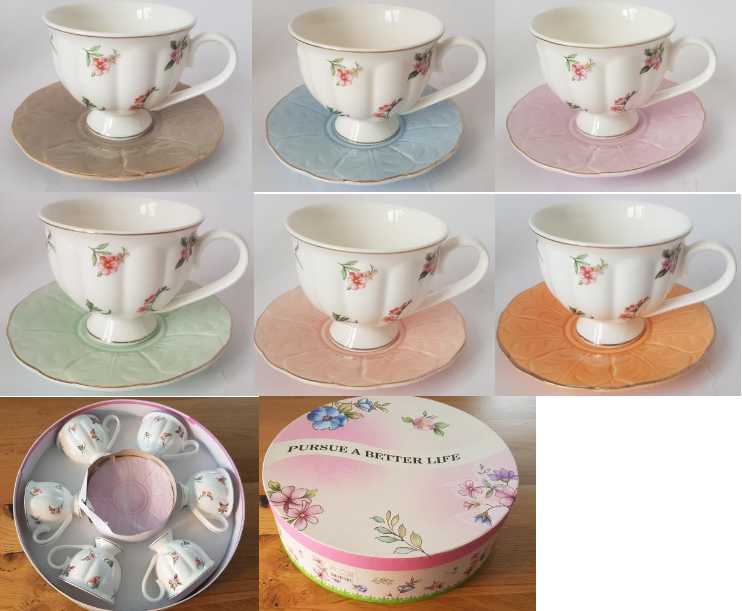 Sada 6ks šálok a 6ks podšálok je vyrobenená z porcelánu, ktorý zaisťuje vysokú kvalitu, trvanlivosť a odolnosť voči používaniu. Všetko je zabalené v darčekvej krabičke, takže je to vhodné ako milý praktický darček.