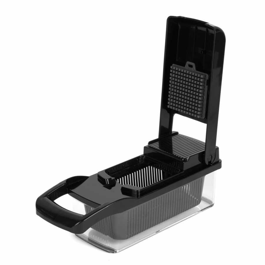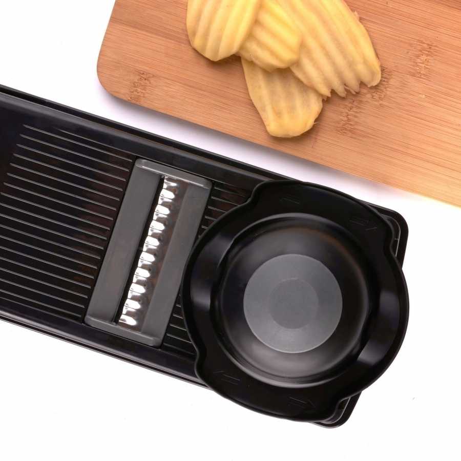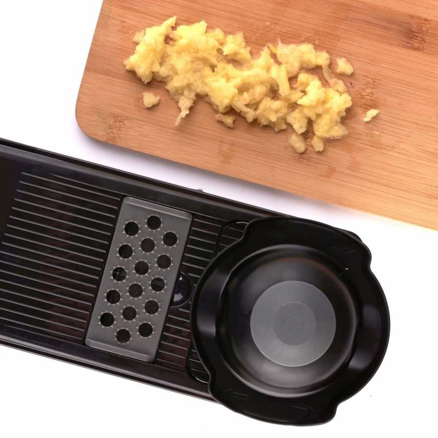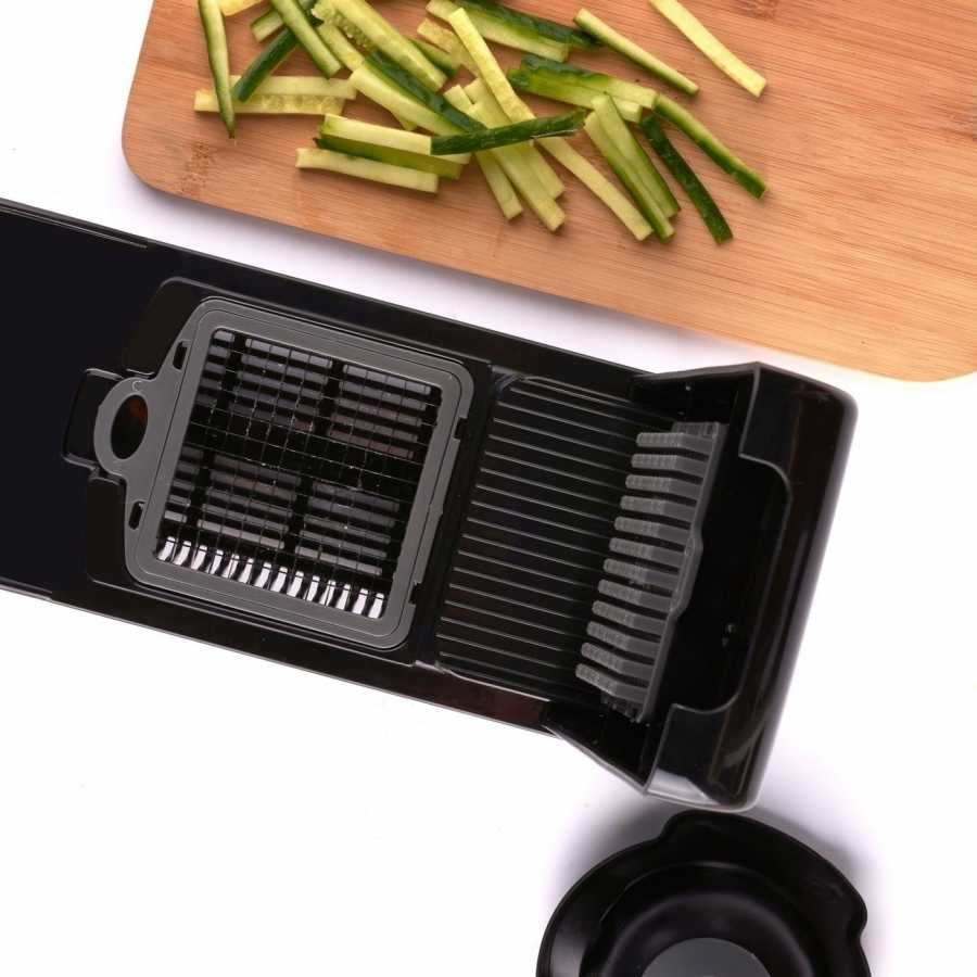 Krájač je vybavený základňou s prísavkou, takže sa ľahko pripevní k doske stola. Pri práci nehýbe. Obsahuje špeciálne zatláčadlo, ktoré je určené na ochranu rúk pred zranením. Oceľové vložky sú ostré a ľahko sa čistia.