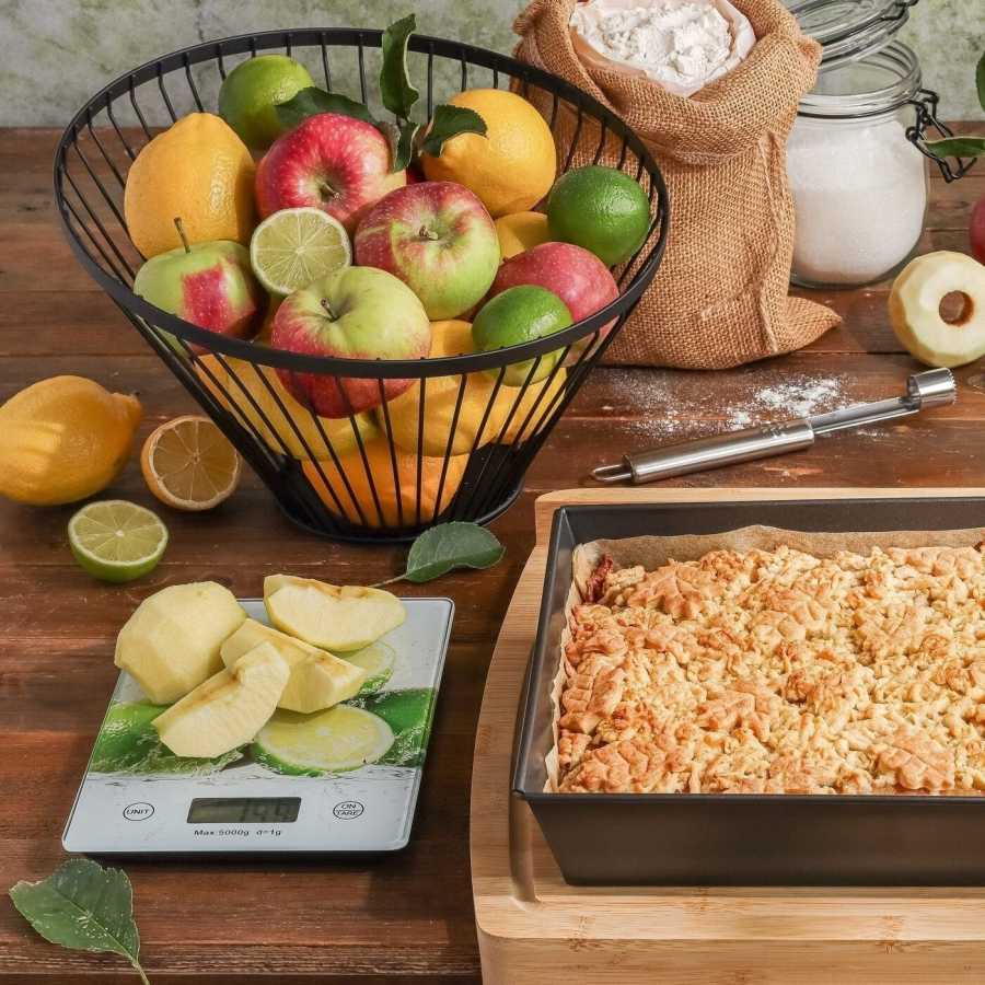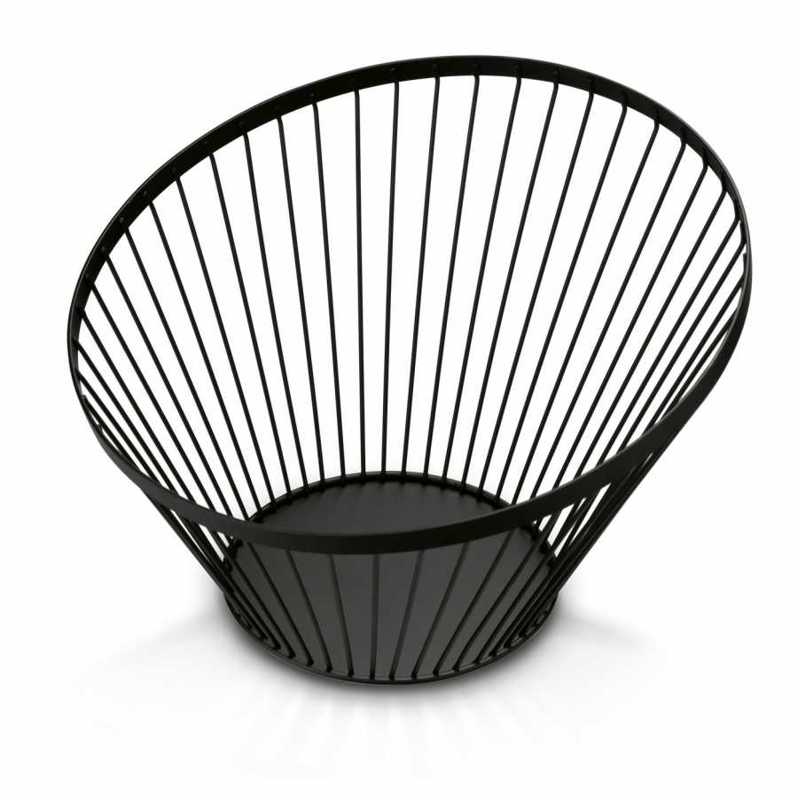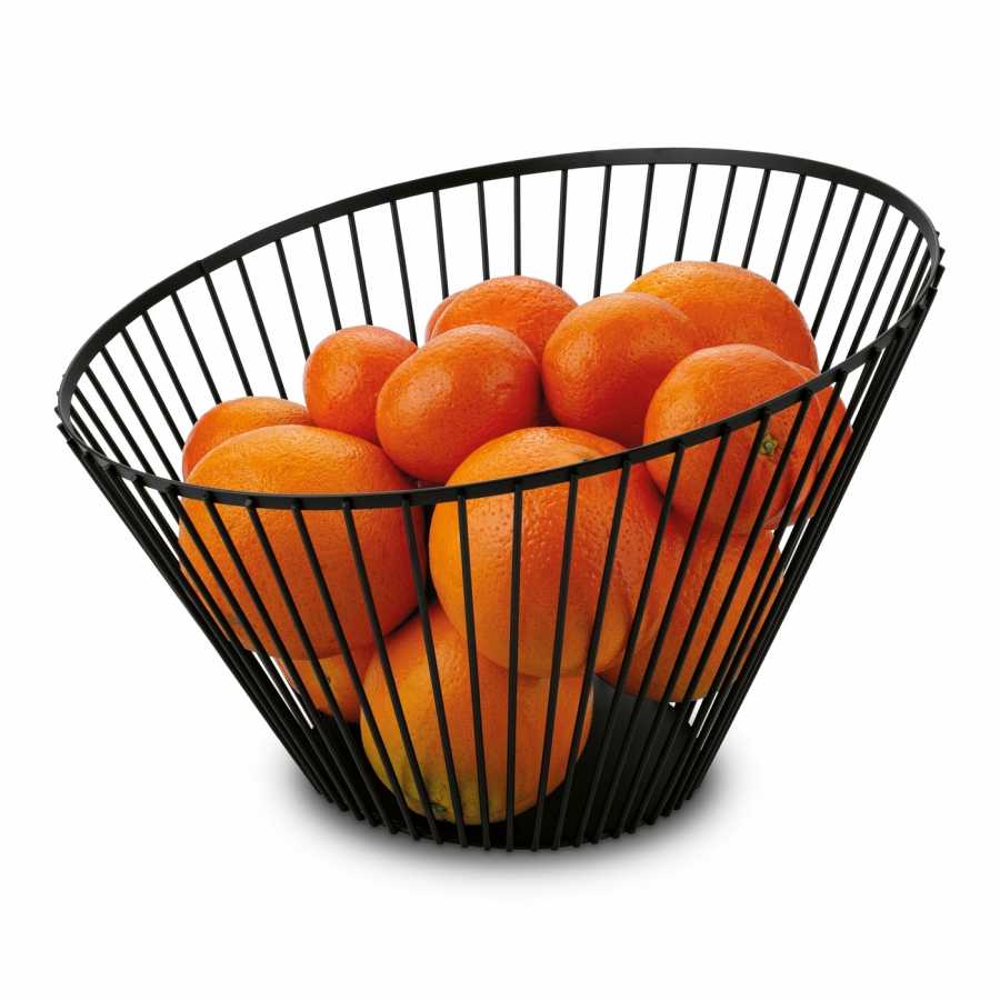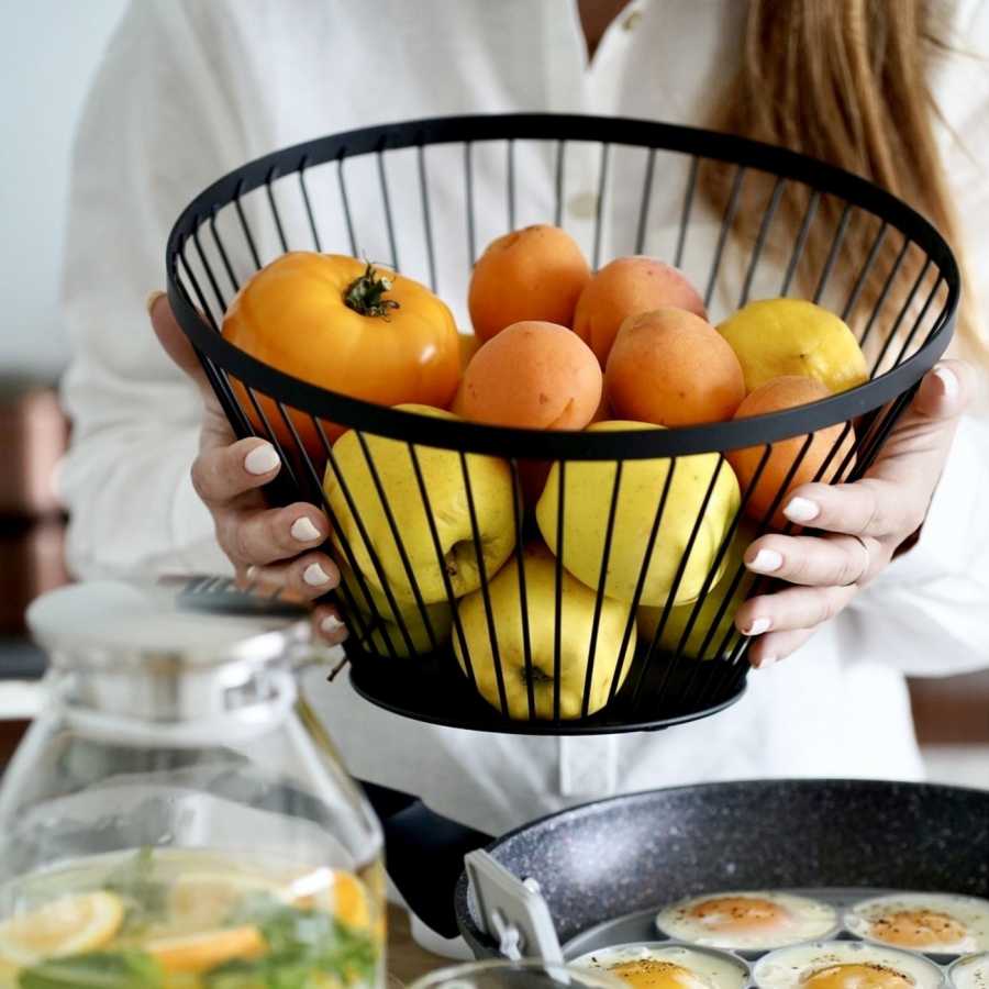 Oceľový sieťovaný košík na ovocie v čiernom matnom lakovaní zabezpečuje hygienické skladovanie ovocia s perfektnou ventiláciou. Asymetrická okrúhla konštrukcia s protišmykovou základňou je praktickou dekoráciou kuchynského pultu.