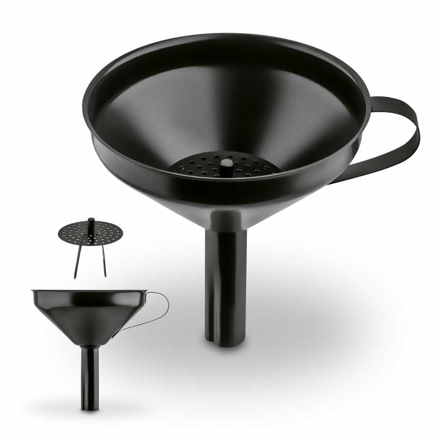Predstavený lievik je kovový, vyrobený z nehrdzavejúcej ocele s práškovým náterom v čiernej farbe, ideálny do domácej kuchyne na dlhé roky používania.