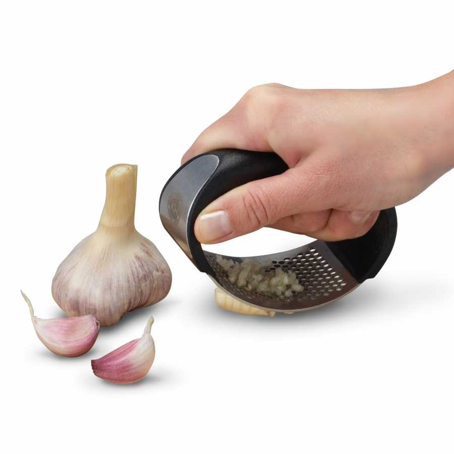 Lis na cesnak vo forme kolísky je účelná pomôcka ktorá nedrví, ale pod tlakom presne krája. Vďaka jeho jednoduchosti je používanie veľmi jednoduché. Lis stačí kývavými pohybmi stlačiť proti strúčiku cesnaku, aby sa roztlačený cesnak umiestnil do zaoblenej plochy lisu. Odtiaľ ho môžete zasunúť priamo do misky. Elegantný vzhľad zaisťuje odolná povrchová úprava z nehrdzavejúcej ocele. Môže sa umývať aj v umývačke riadu. Jeho čistenie uľahčuje aj pribalená kefka.