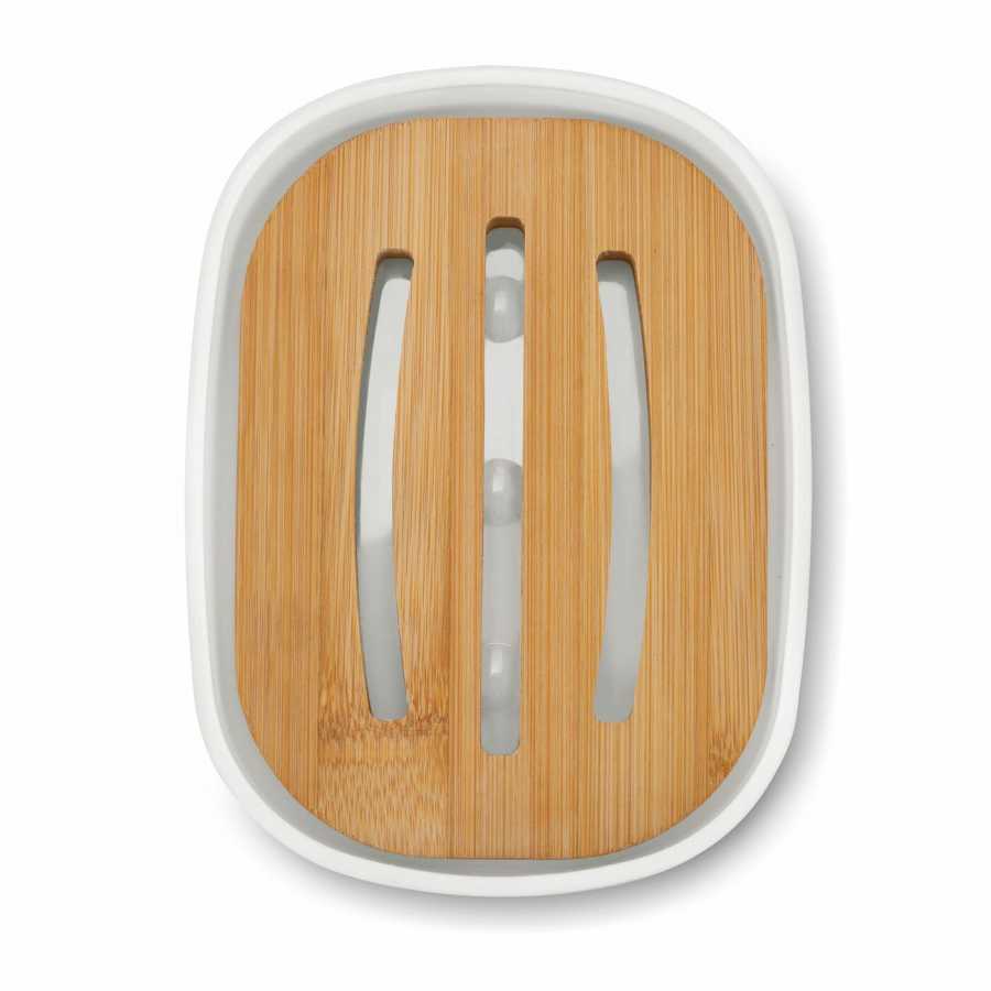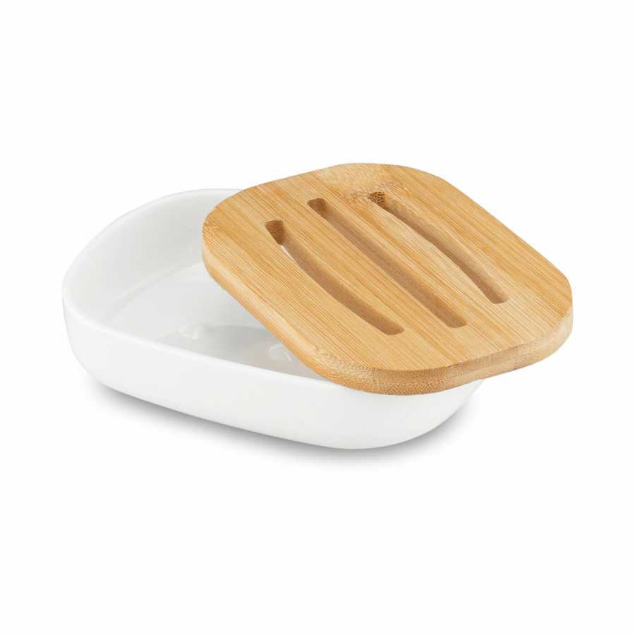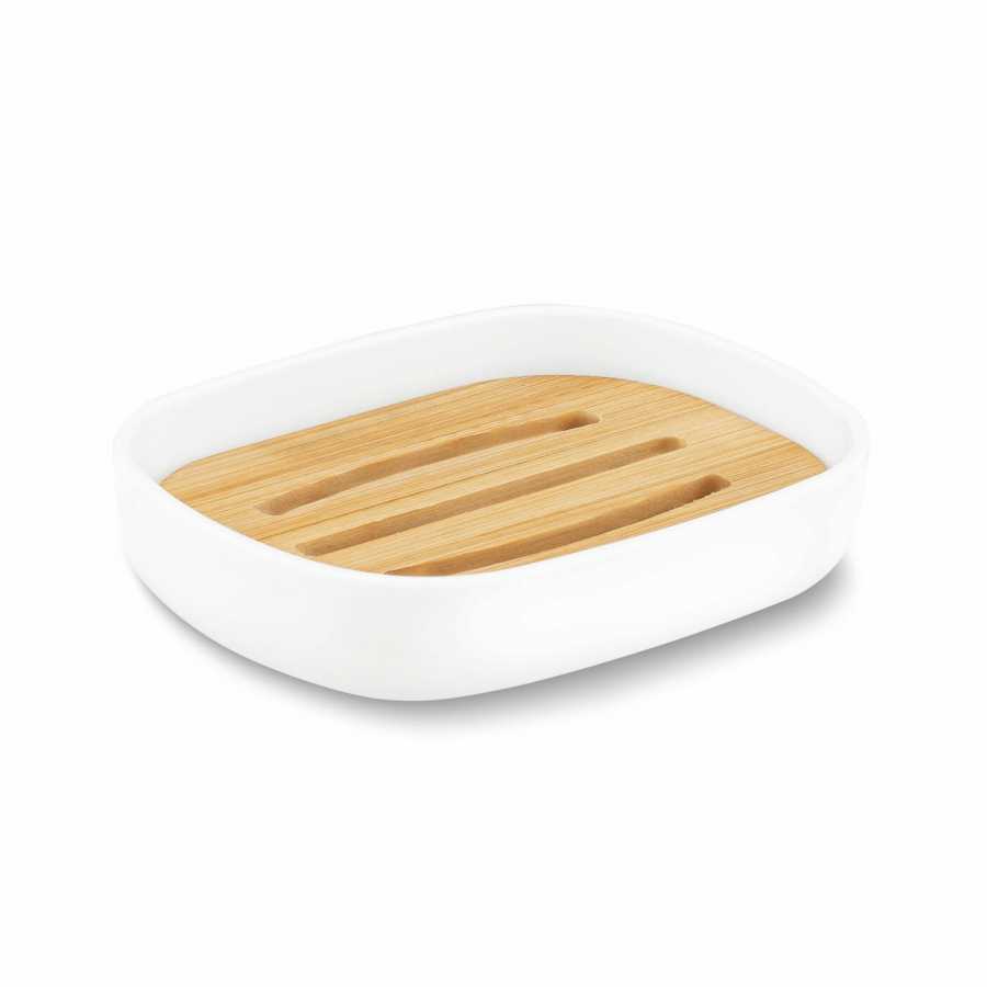 Biela podložka pod mydlo s bambusovým odkvapovačom umožňuje rýchle schnutie mydla a ľahké čistenie. Univerzálny dizajn série Iver dopĺňa kúpeľňové doplnky a stabilne stojí na umývadle či vani.
