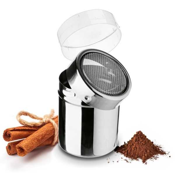 Nádoba na posypávanie z nerezu so sitkom je malá praktická kuchynská pomôcka určená na jemné a rovnomerné posypávanie cukrom, kakaom, škoricou alebo inými práškovými prísadami pri pečení a varení.