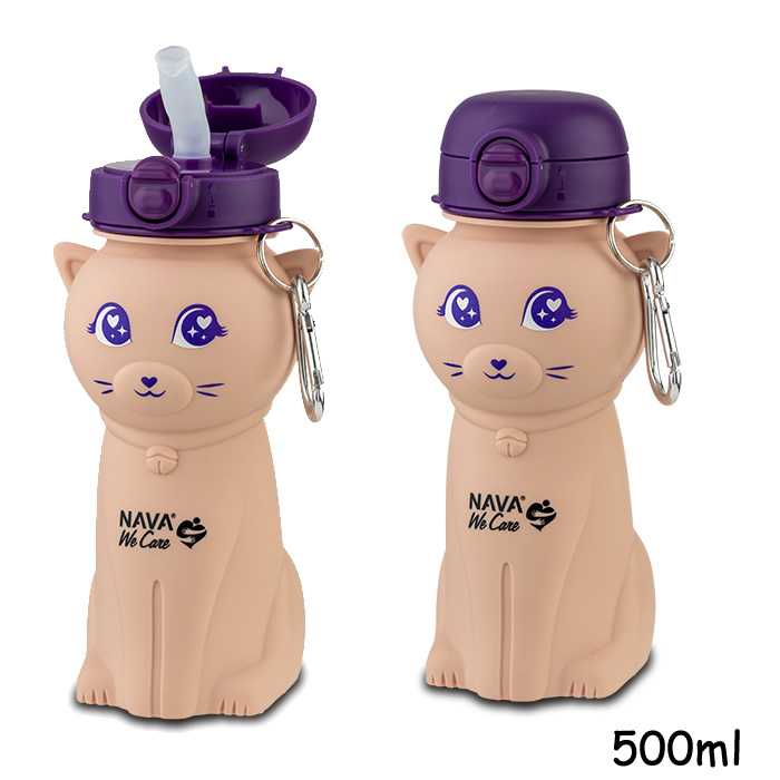 NAVA fľaša pre deti silikónová 500 ml mačiatko so slamkou ružová