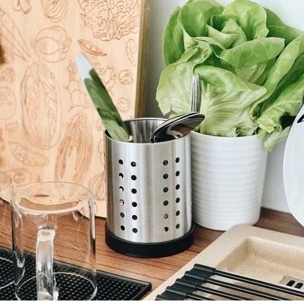 Odkvapávač na príbory zabezpečuje dobré hygienické podmienky pre sušenie príboru. Efektívne oddelí aj stekajúcu vlhkosť od umytého náčinia, navyše je vybavený podstavcom. Stojan stabilne stojí na doske a nezaberá veľa miesta vedľa kuchynského drezu. Jednodielna konštrukcia podporuje stabilné uloženie lyžičiek, príboru, vidličiek, nožov a lyžíc.