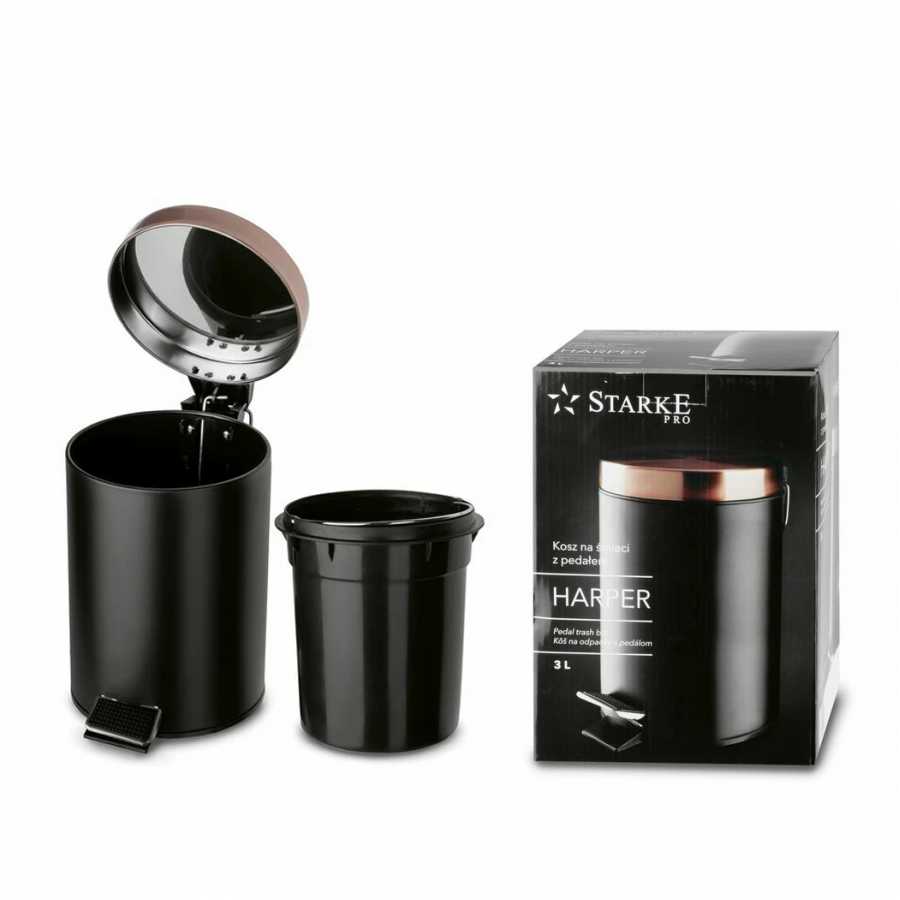Odpadkový kôš čierno-medený 3l Starke Pro Harper s odklápacím vekom a pedálom. To znamená, že nie je potrebné sa zohnúť, aby ste niečo vyhodili a nezašpiníte si ruky. Je vhodný do akejkoľvek miestnosti v domácnosti prípadne aj kancelárii.