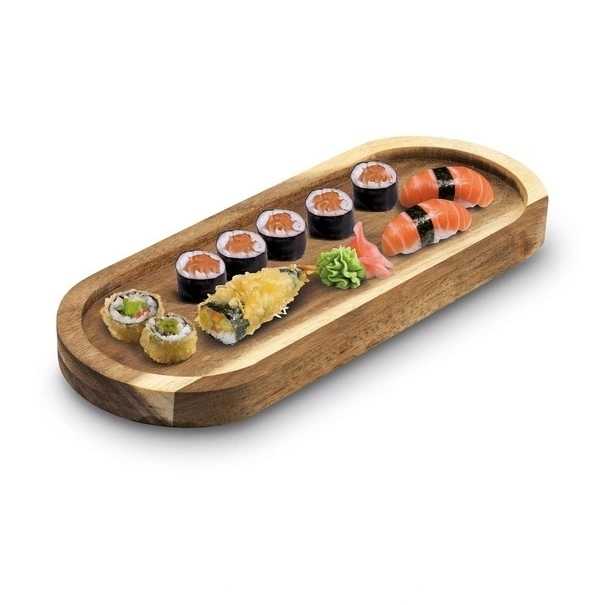 Táto hrubá oválna doska na krájanie je vyrobená z krásne štruktúrovaného akáciového dreva . Je tvrdá, má sýtu farbu a je ideálna do náročných kuchynských priestorov .Vďaka impregnácii je táto doska na krájanie trvalo odolná voči vlhkosti. Okrem toho, že slúži ako doska na krájanie, jej oválny povrch sa dá použiť na servírovanie teplých alebo studených predjedál.