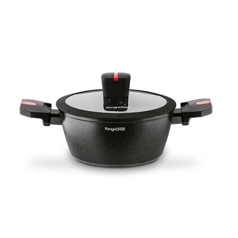 Panvica granitová Konighoffer Fegato, aluminiová panvica s nenahrievajúcimi sa rukoväťami soft touch. Panvice Fegato majú trojvrstvový povrch Greblon® C3 Granite. Povrch sa skladá z podkladovej vrstvy, ktorá zabezpečuje maximálnu odolnosť na otery – 4 hviezdičky – 8000 cyklov, keramickej vrstvy, ktorá zabezpečuje tuhosť povrchu s najlepšími nepripaľujúcimi vlastnosťami s čiastočkami granitu (5 hviezdičiek). To nie je iba zárukou trvanlivosti a odolnostii ale aj jednoduchého udržiavania v čistosti, nič sa nepripaľuje a nelepí na povrch. Jedlá tak sú zdravšie a chutnejšie. Suroviny z ktorých sú vyrobené jednotlive vrstvy sú zbavené uvoľňovania sa teflónu (PFOA Free), čo znamená že panvica je určená na prípravu potravín, nemá žiaden vplyv na zmeny ich chutí, vôní a vlastnosti. Aluminium sa rýchle nahrieva. Dokúpte si sklenenú pokrievku Fegato (sklenená s nerezovou obručou a ventilom), ktorá uzatvára obeh horúceho vzduchu, čo optimalizuje varenie.