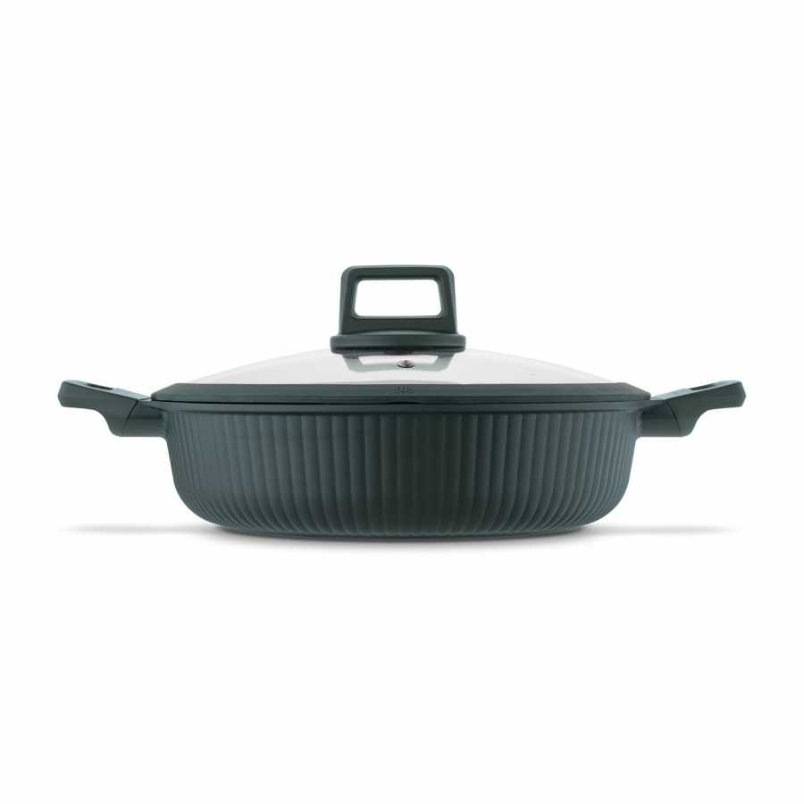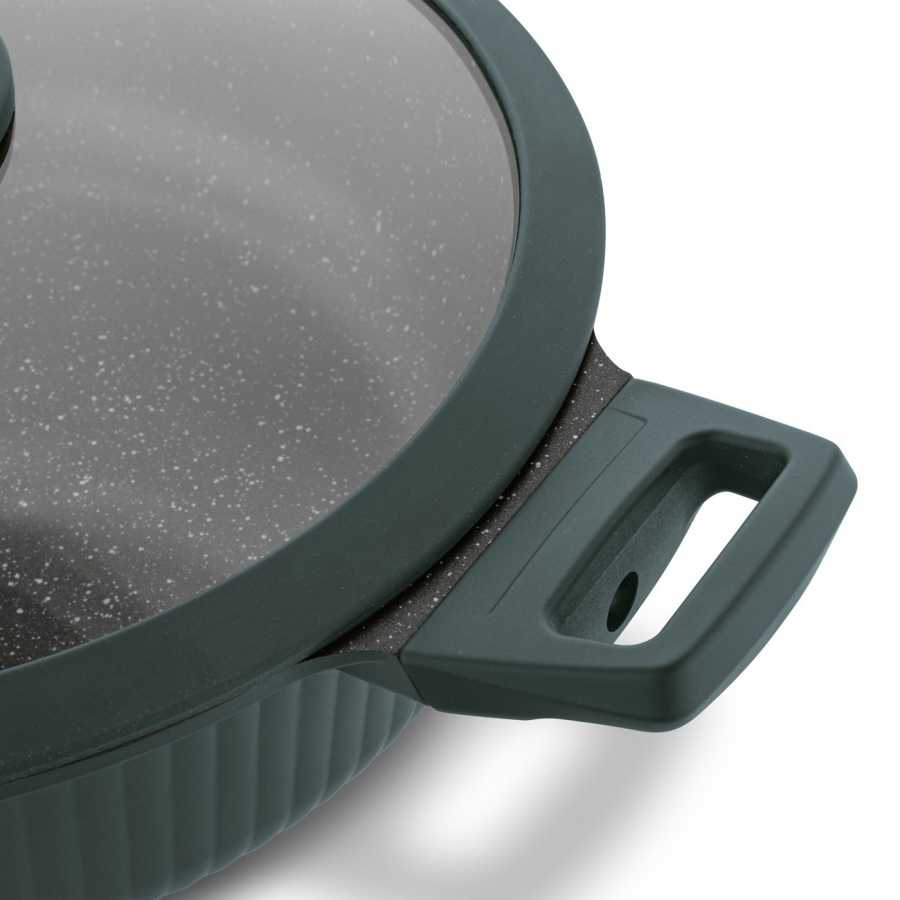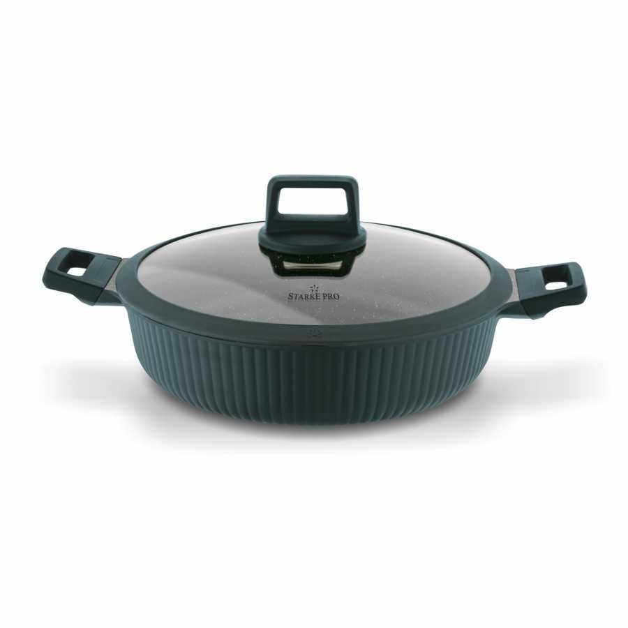 Sarke Pro Eridan plytký hrniec 28 cm-mramorová indukčná panvica s nepriľnyvým povrchom,pokrievkou a 2 krátkymi rukoväťami.Panvica má tvar plytkého hrnca a pokrievku v sete. Jej korpus je veľmi dobre vyvážený a pevný. Je vyrobený z hliníka odliateho technikou die cast. Je preto ťažší ako klasické hliníkové panvice a výborne vedie teplo. Zvonku je zdobený reliéfom. Model je preto vhodný na smaženie a používanie pri vysokých teplotách ako aj na viac hodinové dusenie jedál.Panvica aj pokrievka majú neohrievajúce sa priskrutkované rukoväte soft touch. Sú príjemné na dotyk, ochránia vás pred náhodným popálením a nešmýkajú sa ani vo vlhkých rukách. Pokrievka je sklenená. Jej okraj je vybavený silikónom, ktorý chráni okraj pred odštiepením a zaisťuje tesné priliepenie k nádobe. Navyše má vstavaný šikovný a nenápadný systém odvodu pary.Panvica využíva trojvrstvovú vrstvu MARBLE PLUS. Je veľmi tvrdá a vydrží 10 000 cyklov oderu. To je 5x dlhšie ako ponúkajú neznačkové vrstvy a non-stick nádoby. Vyznačuje sa výbornou priľnavosťou a zvýšenou odolnosťou voči poškriabaniu. V testoch funkčnosti získala vysoké hodnotenie a potvrdila vynikajúce ochranné vlastnosti pred prilepením jedla.