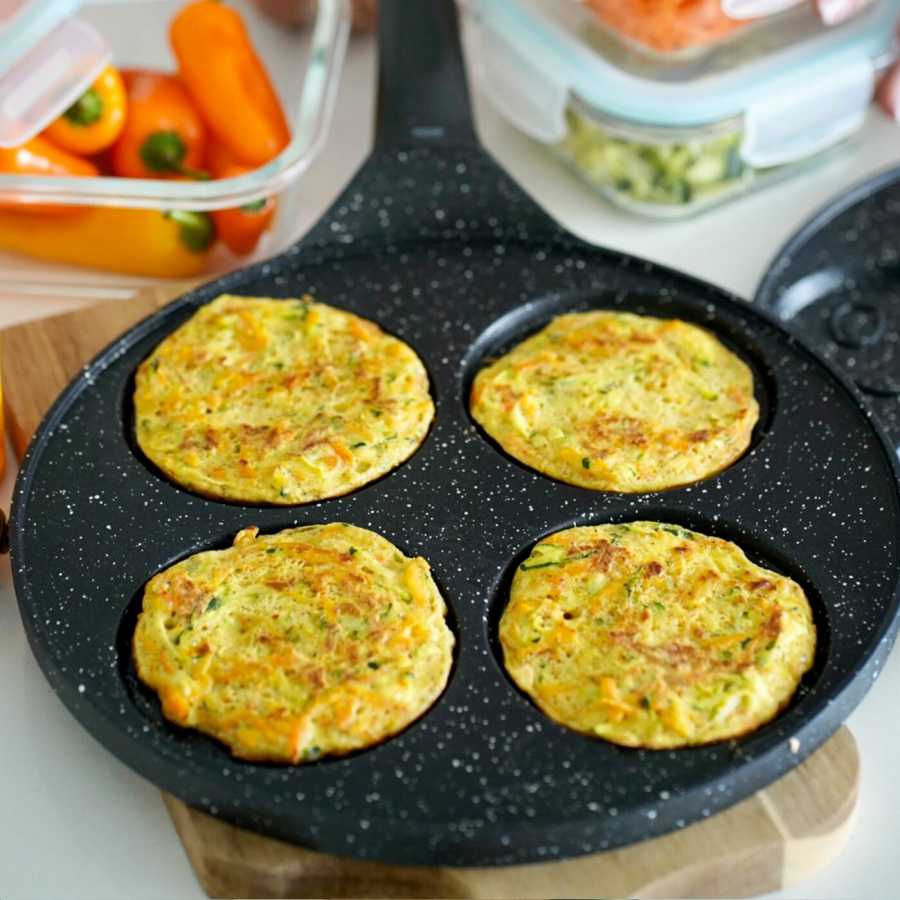 Panvica s 4 okrúhlymi priehlbkami je ideálna na palacinky, lievance alebo volské oká s minimom tuku. Nelepivý mramorový povrch a indukčné dno umožňujú použitie na všetkých typoch sporákov vrátane indukcie.