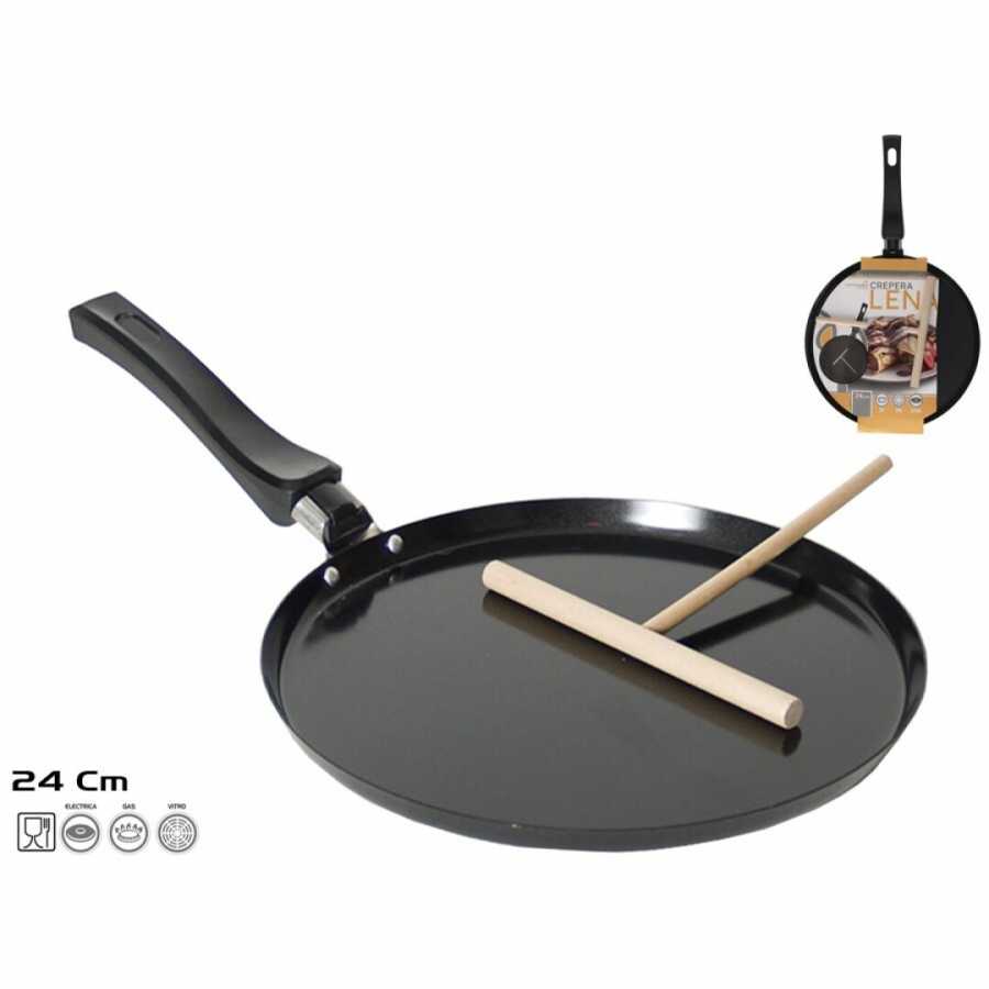Čierna panvica na palacinky s priemerom 24 cm s nepriľnavým povrchom a dreveným oddeľovačom cesta. Drevený oddeľovač umožňuje rovnomerné rozotrieť cesto na panvici