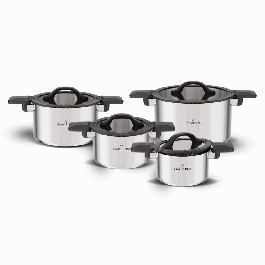 Starke Pro Creativo súprava 8 kusov nerezových hrncov na indukciu a plyn.Sada hrncov je vyrobená z kvalitnej nerezovej ocele 18/10, ktorá zaručuje odolnosť proti poškodeniu a bezpečné varenie počas viacerých rokov. Každý hrniec má päťvrstvové dno, ktoré zabezpečuje rovnomerné zahrievanie a dlhé udržanie teploty, čo podporuje energeticky úsporné varenie. Súpravu možno používať na všetkých typoch sporákov, vrátane indukčných.Nitované rúčky sú spojené s plastovými časťami, ktoré zabraňujú ich zahriatiu, čo uľahčuje prenášanie plných hrncov a zvyšuje komfort pri každodennom varení. Vo vnútri hrncov sa nachádza praktická mierka objemu pre presné odmeranie potrebnej vody. Pokrievky sú z odolného skla, vybavené silikónovým tesnením a ventilom na paru, ktorý zvyšuje bezpečnosť a pohodlie pri používaní.V sade sú hrnce s priemermi 16, 18, 20 a 24 cm, každý s prislúchajúcou pokrievkou. Rôzne objemy (od 1,8 l do 5,9 l) zaručujú vhodnosť ako pre malé porcie, tak pre väčšie rodinné jedlá. Lesklé vonkajšie povrchové úpravy a elegantné detaily dodávajú hrncom moderný vzhľad, ktorý ladí s každou kuchyňou. Možnosť umývania v umývačke zvyšuje užívateľský komfort. Ideálna voľba, ktorá spája trvácnosť, funkčnosť a estetiku – perfektná pre každého domáceho kuchára.