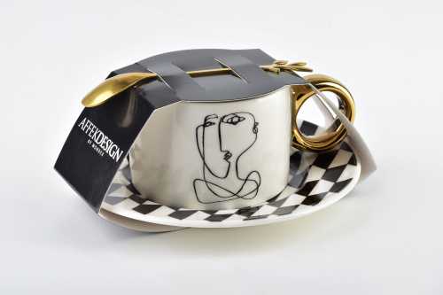 Šálka s podšálkou a lyžičkou bielo-čierna KENDAL