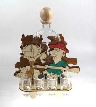 Štamperlíky a fľaša na drevenom stojane s motívom poľovníka