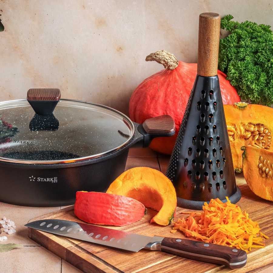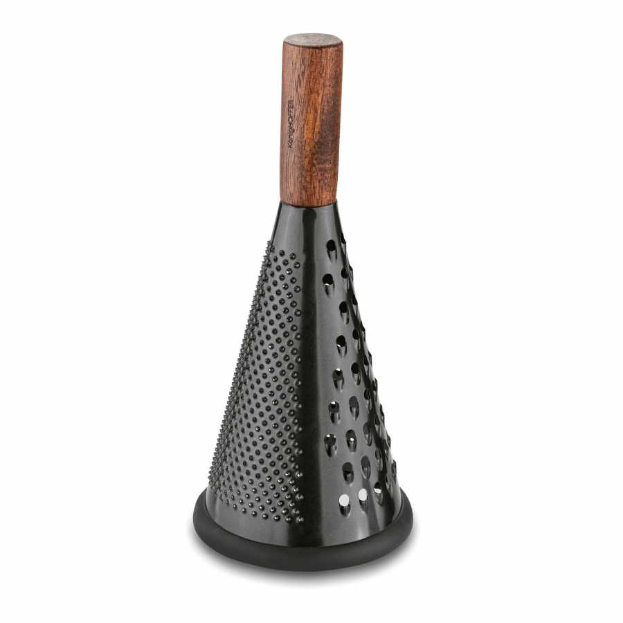 Kúžeľový tvar s protisklzovou základňou zaisťuje bezpečné a stabilné uchytenie na pracovnej ploche počas strúhania. Vďaka kvalitnému nerezovému (uhlíkovému) materiálu je strúhadlo veľmi odolné a jednoduché na údržbu.