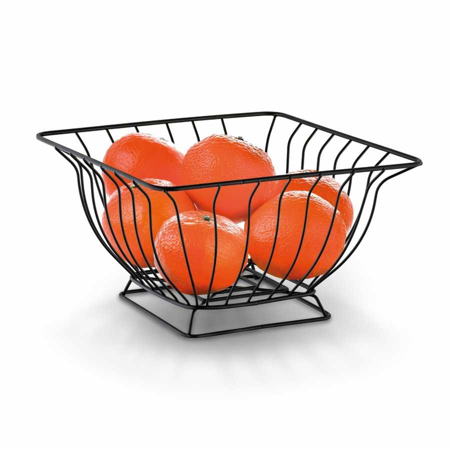 Štvorcový drôtený košík na ovocie v čiernom matnom prevedení s rozmermi 24 x 24 x 12 cm je hygienické a stabilné úložisko čerstvého ovocia. Symetrický tvar a práškové lakovanie ocele z neho robia elegantnú dekoráciu kuchynského stola.