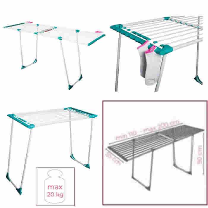 Praktický teleskopický sušiak jednoduchej manipulácie, ktorý v zloženom stave zaberá málo priestoru. Prostišmykové nožičky zabezpečujú jeho stabilitu a zároveň predchádzajú poškriabanie podlahy.