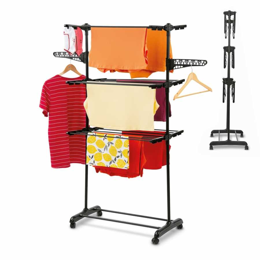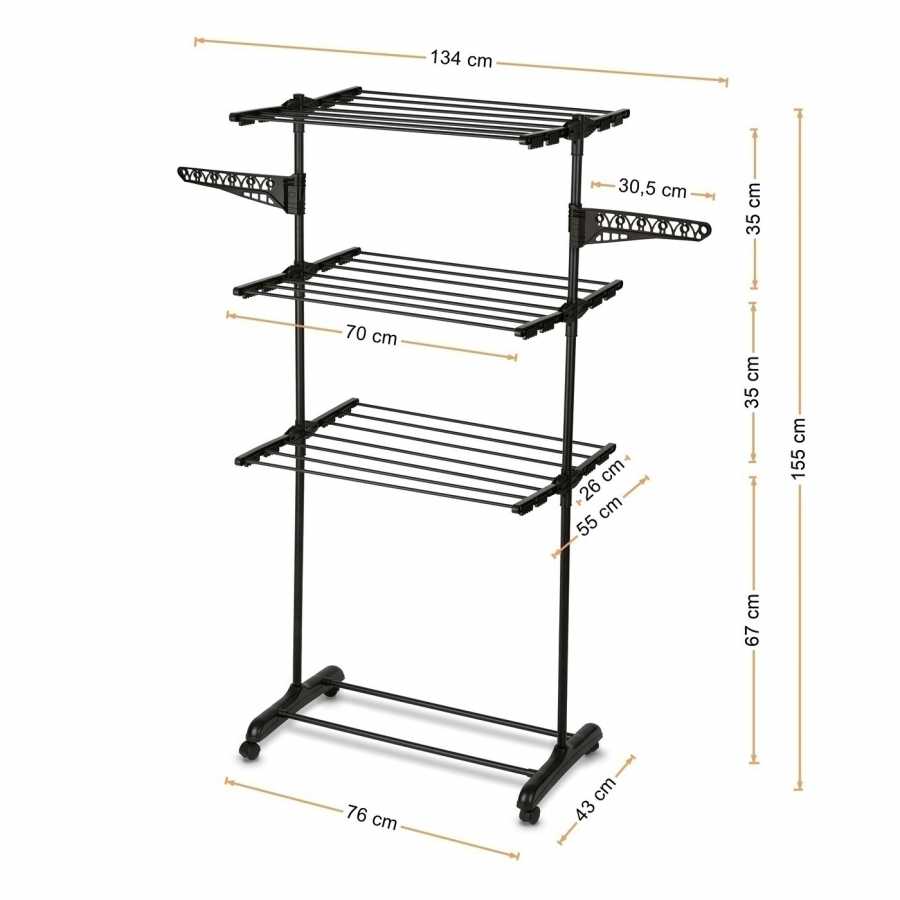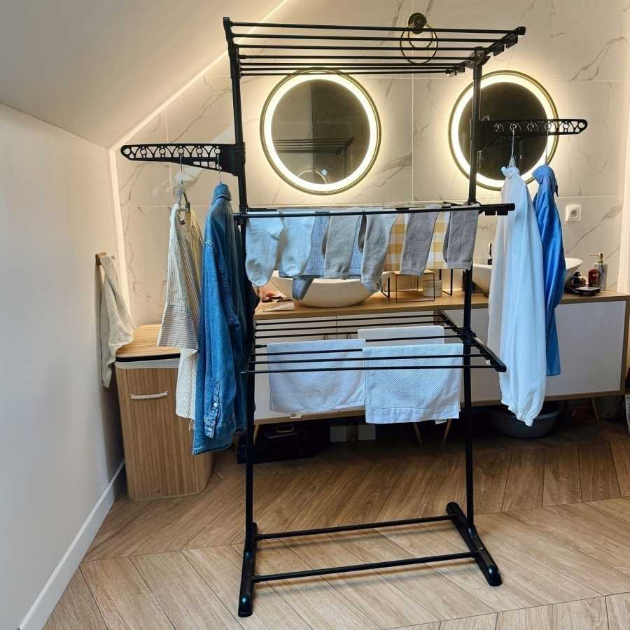 Tento vertikálny sušiak ponúka obrovský priestor sušenia (18 m). Rozkladacie krídla a 3 úrovne umožňujú sušiť aj posteľnú bielizeň. Oceľ s práškovou čiernou farbou zaručuje dlhú životnosť. Skladací dizajn uľahčuje skladovanie.