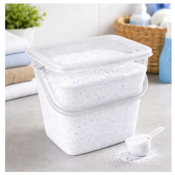 Zásobník na prací prášok, detergenty alebo kapsule s objemom 6 l chráni pred vlhkosťou a znečistením. Praktický uzatvárací viečko s úchytom uľahčuje prenášanie a dávkovanie, ideálny na uloženie v kúpeľni alebo práčovni.