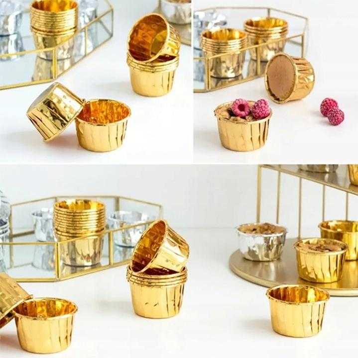 Zlaté papierové košíčky na muffiny a cupcakes v sade 100 kusov zvýšia štandard vašich pečených dobrôt. Kombinácia papiera a hliníka s metalizovanou povrchovou úpravou zaisťuje stabilitu, dobré vedenie tepla a elegantný vzhľad bez prilepenia.